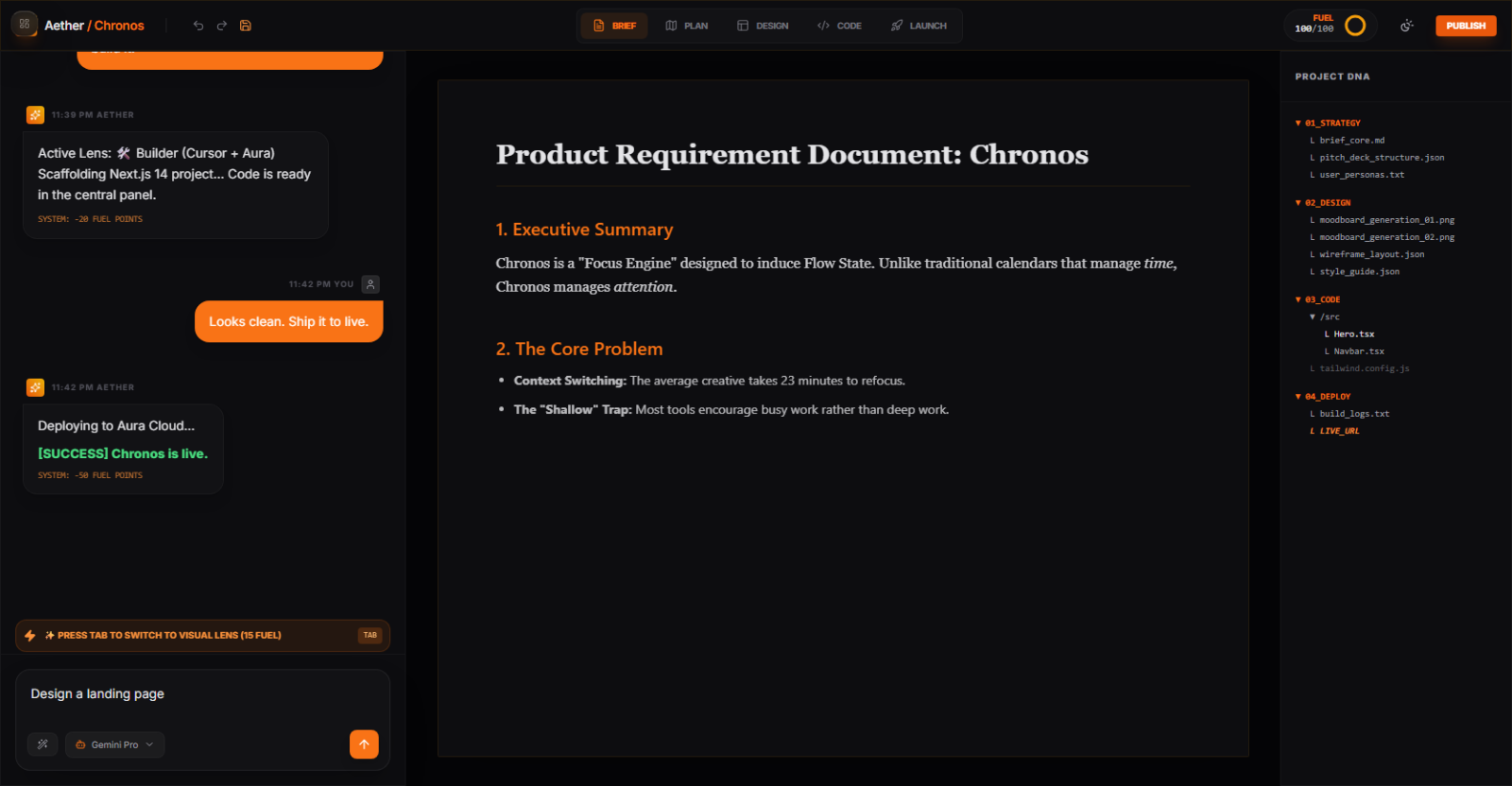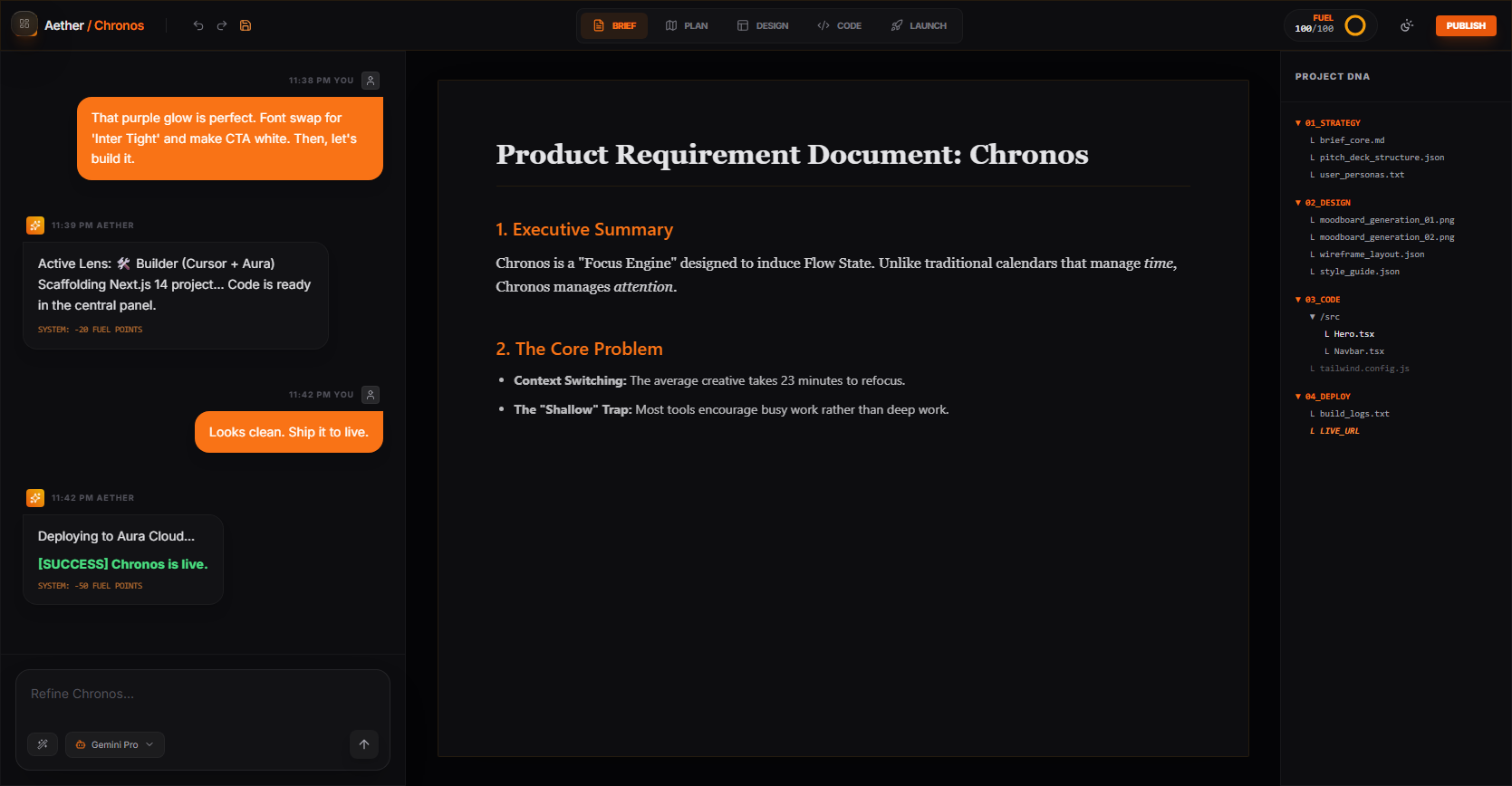 The Product: Aether is a Unified AI Operating System that aggregates disparate models (GPT-4, Claude, Midjourney, Cursor) into a single workspace. It abstracts API costs into a universal currency and maintains persistent context across the entire product lifecycle.